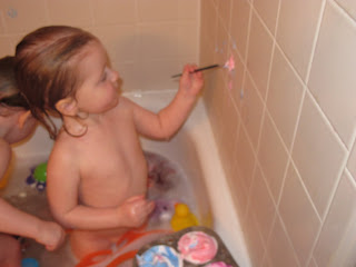 Last night for bath time I made paint for the girls out of shaving cream and liquid watercolors in muffin tins. They had so much fun and were entertained for about 45 minutes!